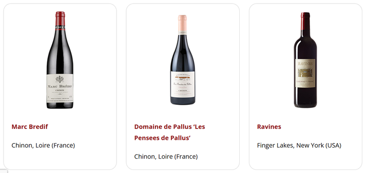 DOLINA LOARE/Loire Valley: Cabernet Franc je najpopularnija crna sorta u dolini Loare. Najbolji primjeri su u Touraine, u podregijama Chinon i Bourgueil. Chinon će biti lagan i elegantan, sa okusima maline i paprike, te dobrom kiselošću. Vina Bourgueil (ovdje je Cabernet Franc prvi put zasađen) su malo tamnija, teža i snažnija za ovu sortu. Oba su sočna i odlična vina za uzajamno uživanje!