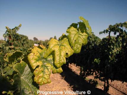 U normalnim godinama, možemo vidjeti nedostatak kalijuma na srednjim listovima izdanaka (foto 1) ili ako je rod težak tokom sazrijevanja, na nekoliko listova na vršnim krajevima izdanaka (foto 2). Ove godine, međutim, vidimo nedostatak kalijuma koji se ponekad proteže prema dolje od vrha izdanka na nekoliko listova. Kako je kalijum požurio do ploda tokom abnormalnog procesa brzog sazrijevanja, lišće je postalo hlorotično i svi smo dobili lekciju iz vinogradarstva o simptomima nedostatka kalijuma (foto 3).