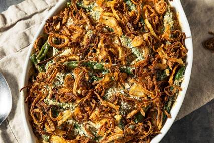 Tepsija od zelenog graha je kremasti, umami sok, ali svjež blagdanski/praznički klasik. Amy Racine, direktorica pića u njujorškoj grupi za ugostiteljstvo JF Restaurants, fokusiranoj na povrće, uz to servira Grüner Veltliner. „Papreno je, hrskavo i pogodno za povrće“, kaže Racine. „To je jedna od najlakših kombinacija sa bilo čim zelenim ili Pinot Blanc iz Alsace, jer je blagog voćnog okusa sa puno teksture za taj kremasti složeni spoj, a opet lakšeg tijela od bijelog vina odležanog u hrastovom buretu.“