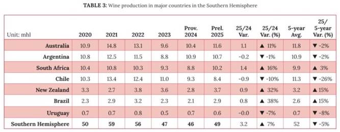 Južna hemisfera ima ukupno 49 miliona hektolitara i zabilježila je oporavak u odnosu na 2024. godinu (+7%, ali -5% u pet godina). Rezultat povećanja podstaknut je poboljšanim uslovima u Južnoj Africi, Australiji, Novom Zelandu. (3,7 miliona hektolitara, +32% u odnosu na 2024. i +15% u petogodišnjem prosjeku) i Brazilu, što je nadoknadilo značajan pad zabilježen u Čileu.