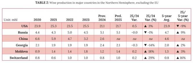 U Evropskoj uniji (sa procijenjenom berbom od 140 miliona hektolitara u 2025. godini), proizvodnja je blago porasla u odnosu na 2024. godinu (+2%). Ali je i dalje znatno ispod petogodišnjeg prosjeka (-8%). Stari kontinent i dalje doživljava visoku klimatsku varijabilnost. Pri čemu Francuska (-1% u poređenju sa 2024. godinom i -16% u petogodišnjem prosjeku). Te Španija (-6% u poređenju sa 2024. godinom i -15% u petogodišnjem prosjeku). Obe zemlje bilježe vrlo niske berbe, za razliku od Italije (+8% u poređenju sa 2024. godinom, +2% u odnosu na petogodišnji prosjek). U ostatku sjeverne hemisfere, objašnjava OIV, rezultati su bili mješoviti. Sjedinjene Američke Države su zabilježile samo djelimičan oporavak od loše berbe u 2024. godini. (+3%, ali -9% u poređenju sa petogodišnjim prosjekom).