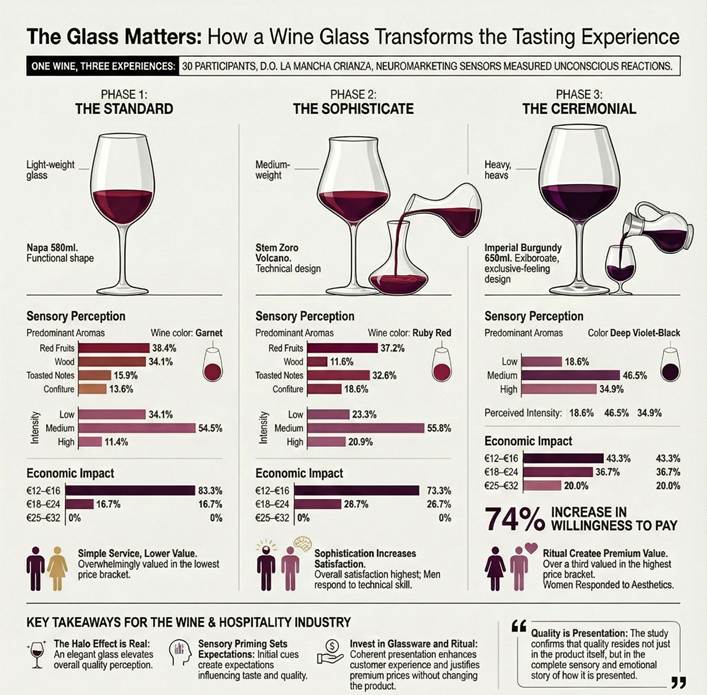 Tokom eksperimenta, svaki učesnik je probao isto vino sorte, Crianza iz DO La Mancha, natočeno iz magnum boce, u tri različita scenarija. Jedine varijable bile su tip čaše i način posluživanja. U prvoj fazi, vino je posluženo u laganoj, klasičnoj čaši sa standardnim, funkcionalnim posluživanjem. U drugoj fazi, vino je natočeno u stilizovaniju čašu nakon što je dekantirano pred učesnicima. Treća faza je uključivala tešku, veliku čašu i raskošno ceremonijalno posluživanje vina koje je naglašavalo ekskluzivnost.