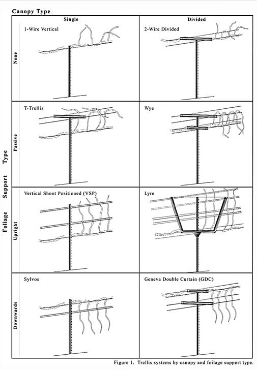 Sledeća odluka u procesu dizajniranja vinograda uključuje izbor naslona/potpore za lišće. Postoje četiri osnovne vrste/tipa koje možete izabrati – bez potpore lišću, pasivna potpora lišću, uspravna i vertikalna potpora lišću i potpora lišću usmjerena prema dolje (šema 2).