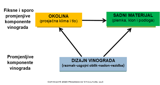 Proces dizajniranja vinograda započinje procjenom faktora okoline – klime i tla – koji su, iz perspektive upravljanja vinogradom, uglavnom stabilni (šema 1, tabela 3). Takve procjene su često najznačajnije kada se provedu nakon što je korjenova zona vinograda dovoljno izmijenjena i duboko obrađena. Na osnovu procjene i približne vrijednosti potencijala rasta sorte i podloge, izvršite najbolju procjenu veličine čokota i kapacitet rasta. Ovaj, možda i najteži dio dizajniranja vinograda, zahtijeva iskustvo, a ponekad i dodatnu stručnost iz jednog ili više vanjskih izvora.