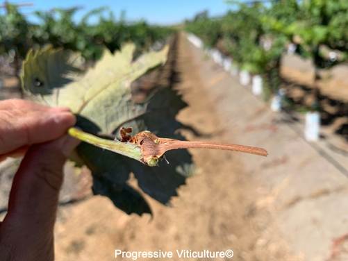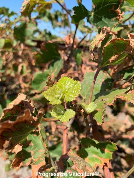 Nakon navodnjavanja poslije berbe radi ublažavanja stresa, mala količina novog lišća trebala bi se pojaviti u vinogradu. Dobro vođen rast izdanaka nakon berbe sastoji se od samo nekoliko čvorova i malih listova (foto 2). Njihova pojava je potvrda ublažavanja stresa i poboljšanog metabolizma vinove loze, uključujući fotosintezu. Pojava više od nekoliko novih čvorova izdanka, koji neće preživjeti zimu, obično je loša investicija među resursima čokota.