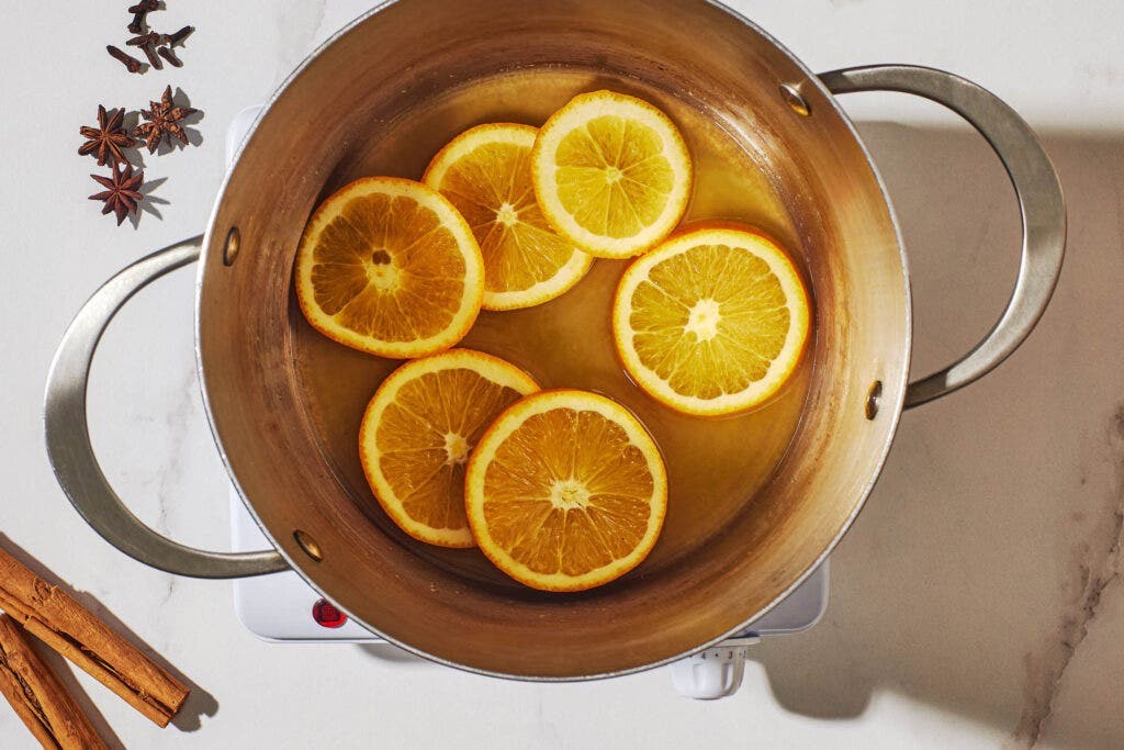 1.Jednu narandžu narežite na kolutove, a drugu prepolovite. Stavite krugove u lonac srednjeg teškog dna ili malu holandsku pećnicu. Iscijedite sok od preostalih narandži u šerpu.